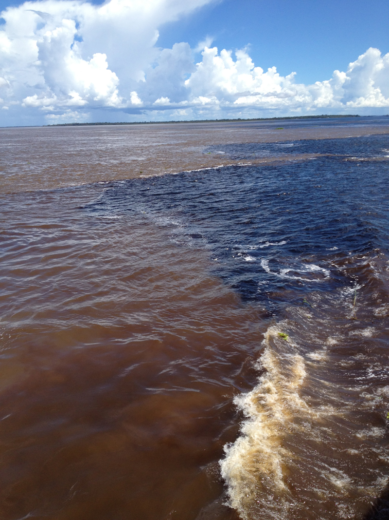 No começo da tarde vimos o famoso encontro das águas dos rios Negro e Solimões, um fenômeno muito bonito, em que as águas, de tonalidades e propriedades físicas diferentes, simplesmente não se misturam, formando enormes manchas de água preta e marrom na superfície do rio.