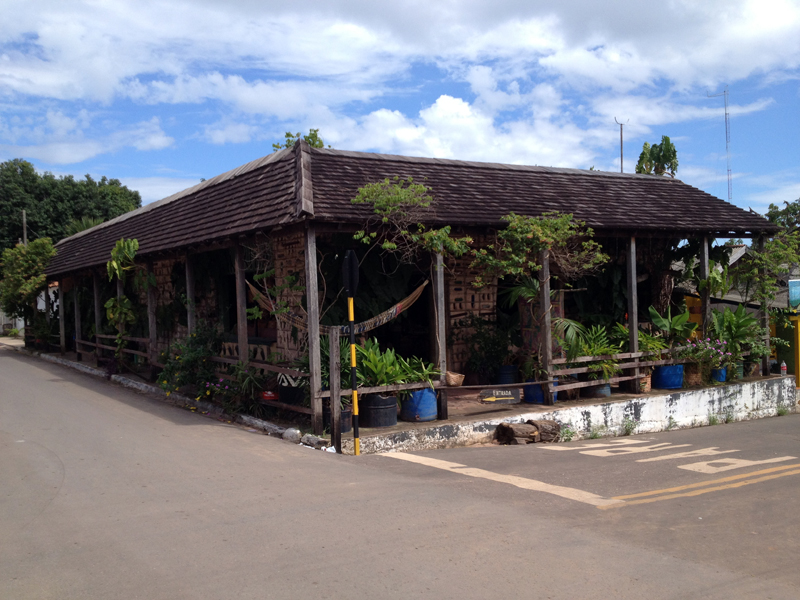 Ontem já havíamos visto uma loja que chama atenção em Alter do Chão pela fachada cheia de plantas e com paredes feitas de garrafas de vidro. Hoje entramos na Araribá e vimos que ela é mais que isso, possui muito material e parece ser uma forte referência de cultura indígena em escala mundial. O dono viaja para as mais diversas aldeias e comunidades indígenas, especialmente brasileiras, encontrando e escolhendo objetos que coloca à venda aqui.