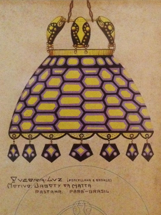 Above, “Lâmpada açaí” – from Luiz Braga (online archive MAM); drawings of wallpaper (crab theme) and lamp (turtle theme) by Manoel Pastana; and Marajoara funerary urn.